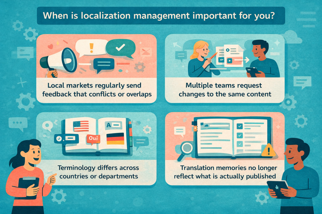 Localization usually requires management when multiple markets are involved, content is updated frequently, or several teams review and influence language decisions. If consistency becomes hard to maintain or discussions repeat, localization management helps restore clarity and control.