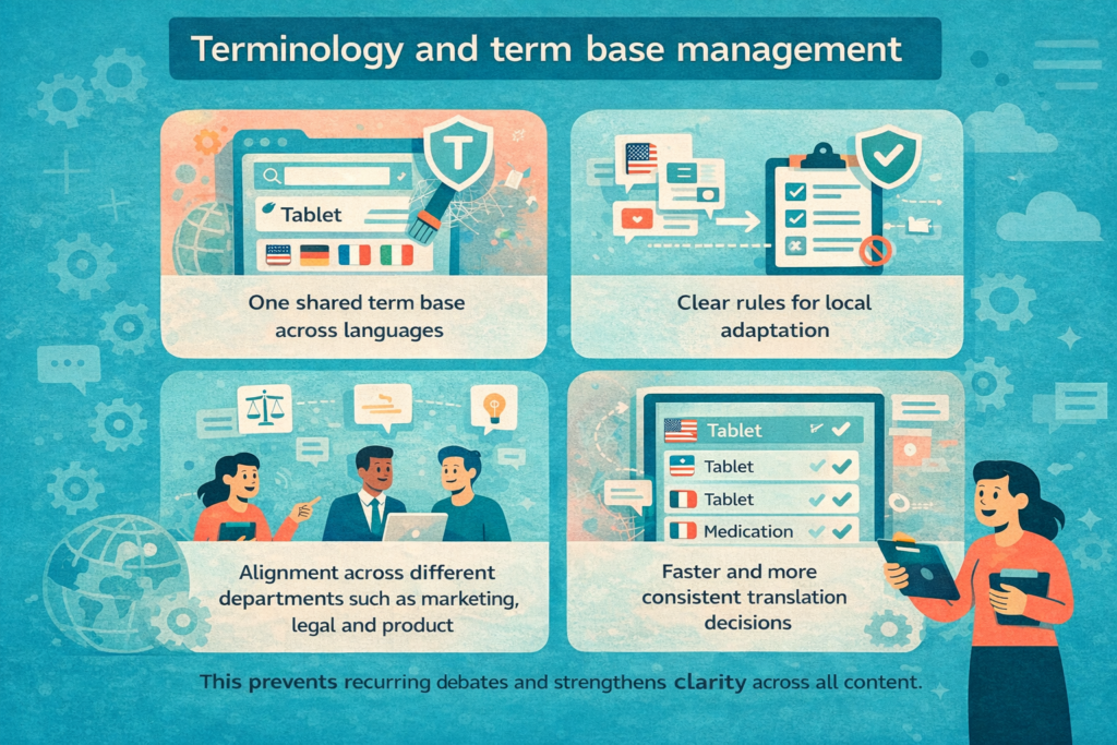 Product names, legal concepts and brand language often evolve differently across markets and departments. Without governance, teams create their own versions and inconsistency spreads quietly.