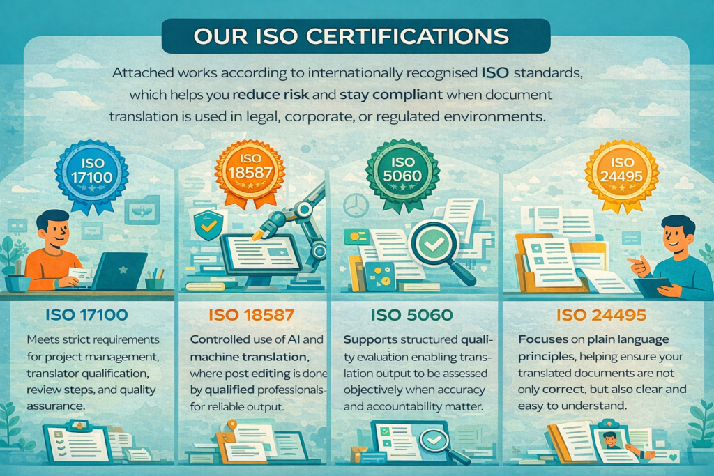 Attached works according to internationally recognised ISO standards, which helps you reduce risk and stay compliant when document translation is used in legal, corporate, or regulated environments.